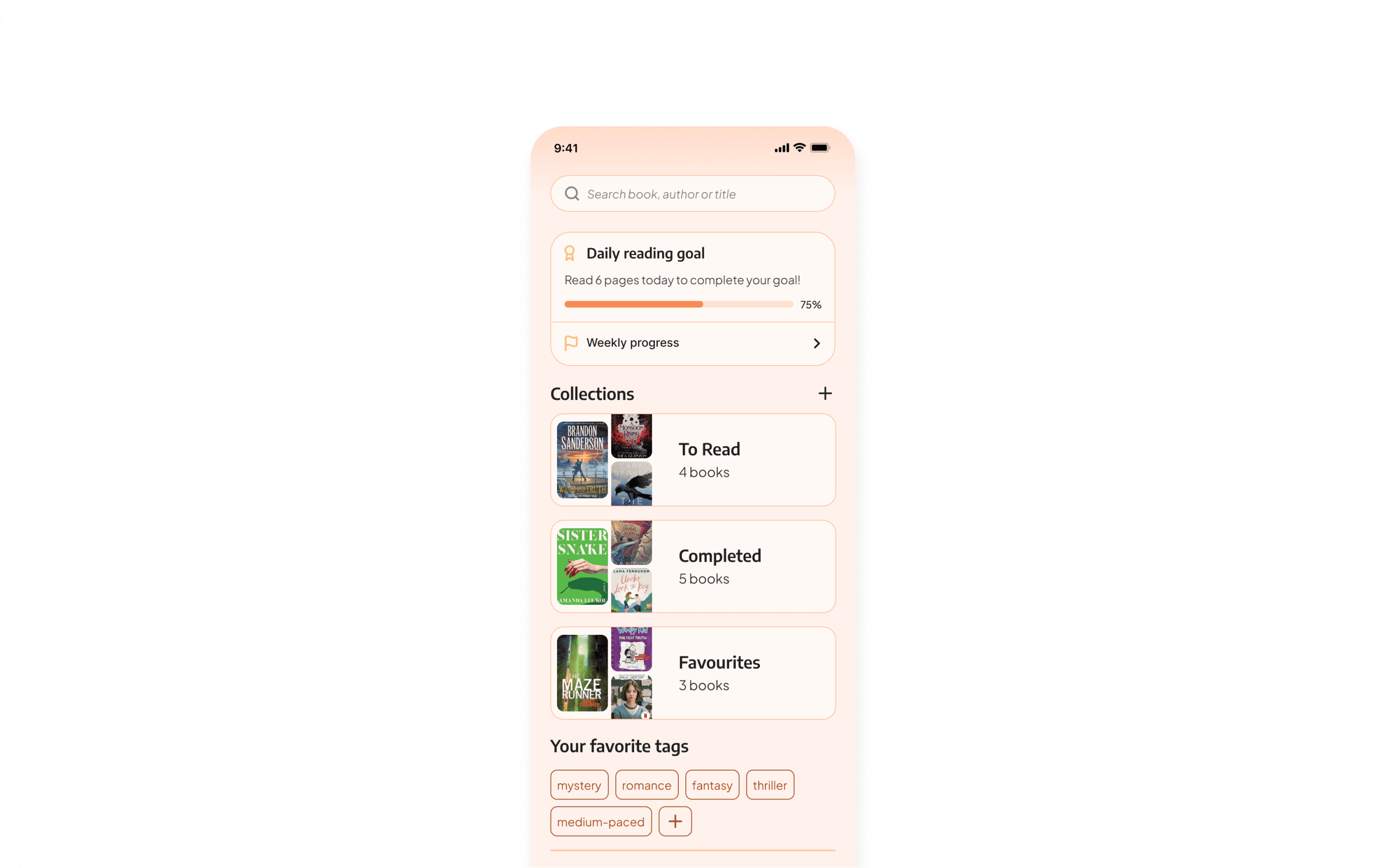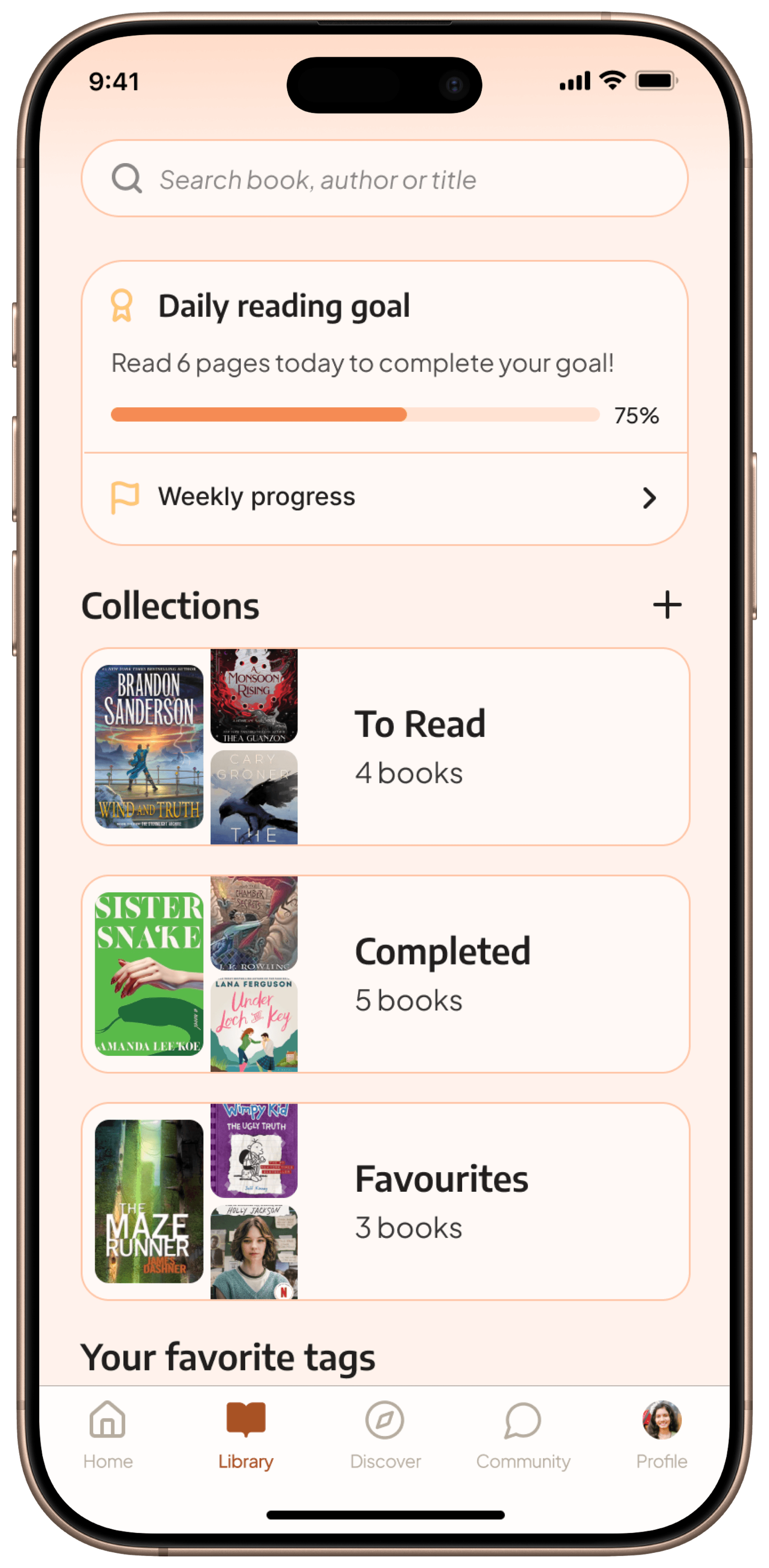I designed the library as a reading hub that combines progress tracking with habit-building, allowing users to track daily goals, view weekly progress, organize collections, and use custom tags.