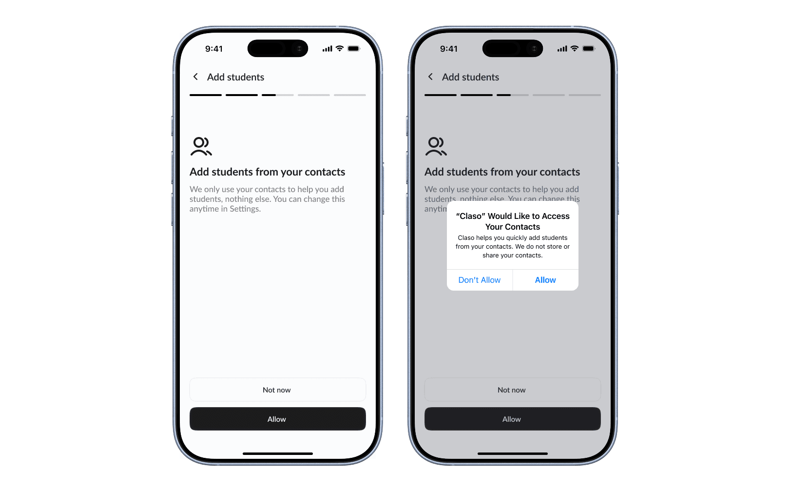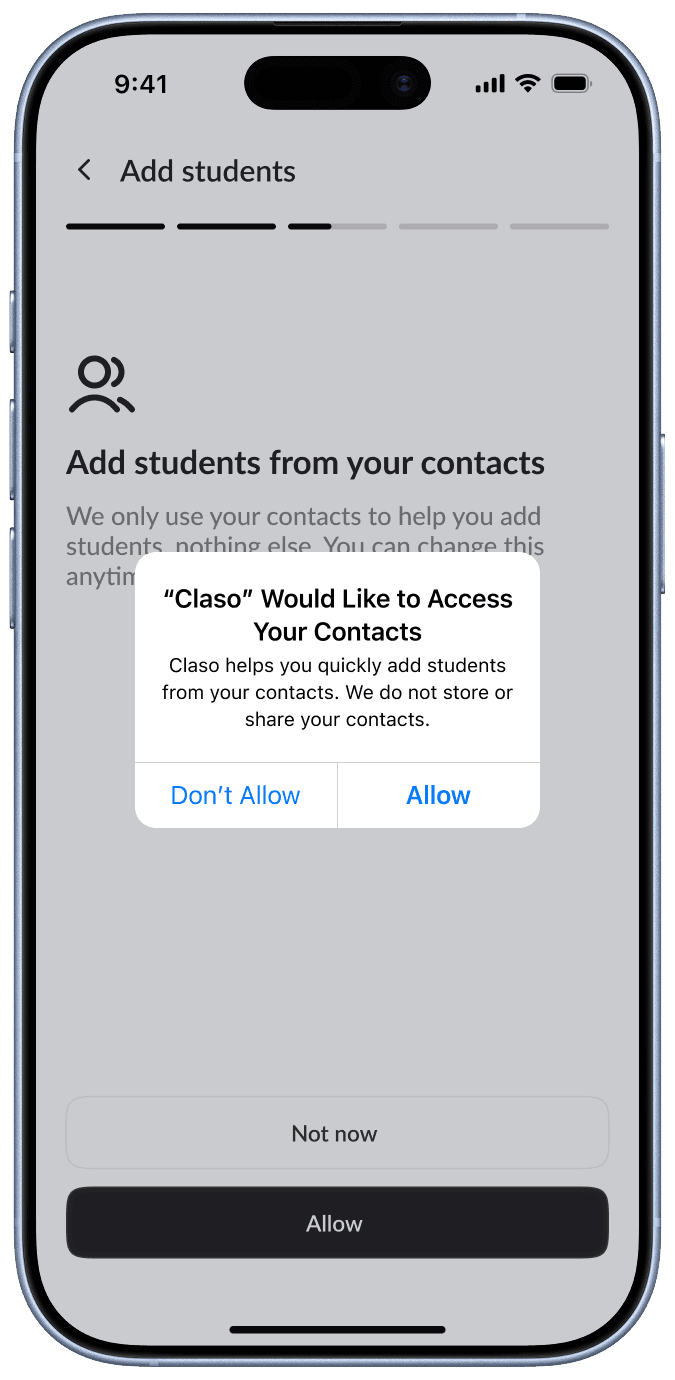 Instead of requiring users to manually add student details, the flow prioritizes importing students directly from contacts. This reduces the effort needed during setup and ensures that basic information like names and phone numbers are instantly available.