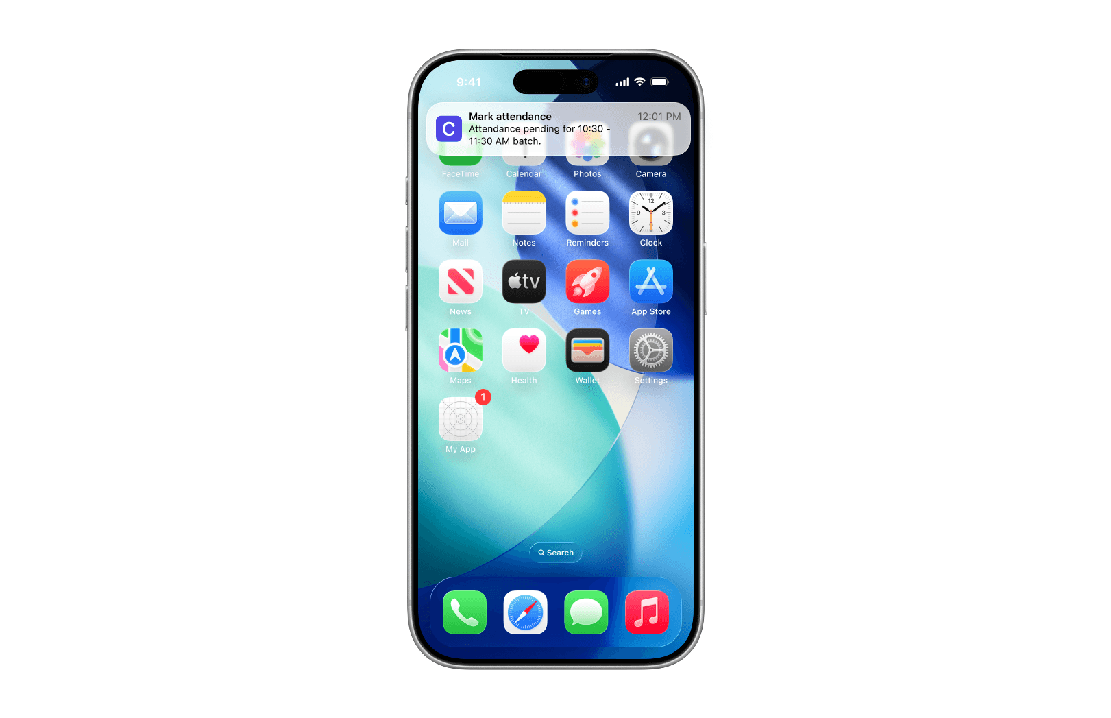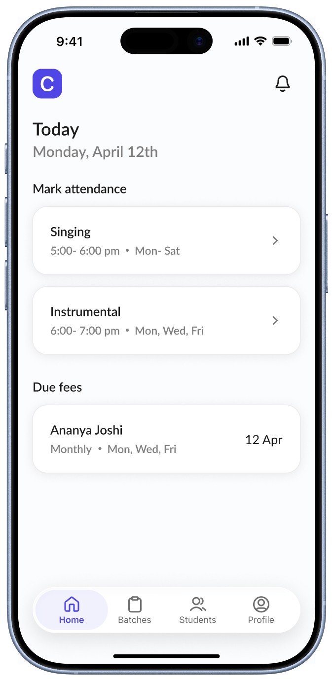 The home screen is designed to surface the most time-sensitive actions, marking attendance and tracking due fees, instead of acting as a traditional dashboard with multiple entry points.