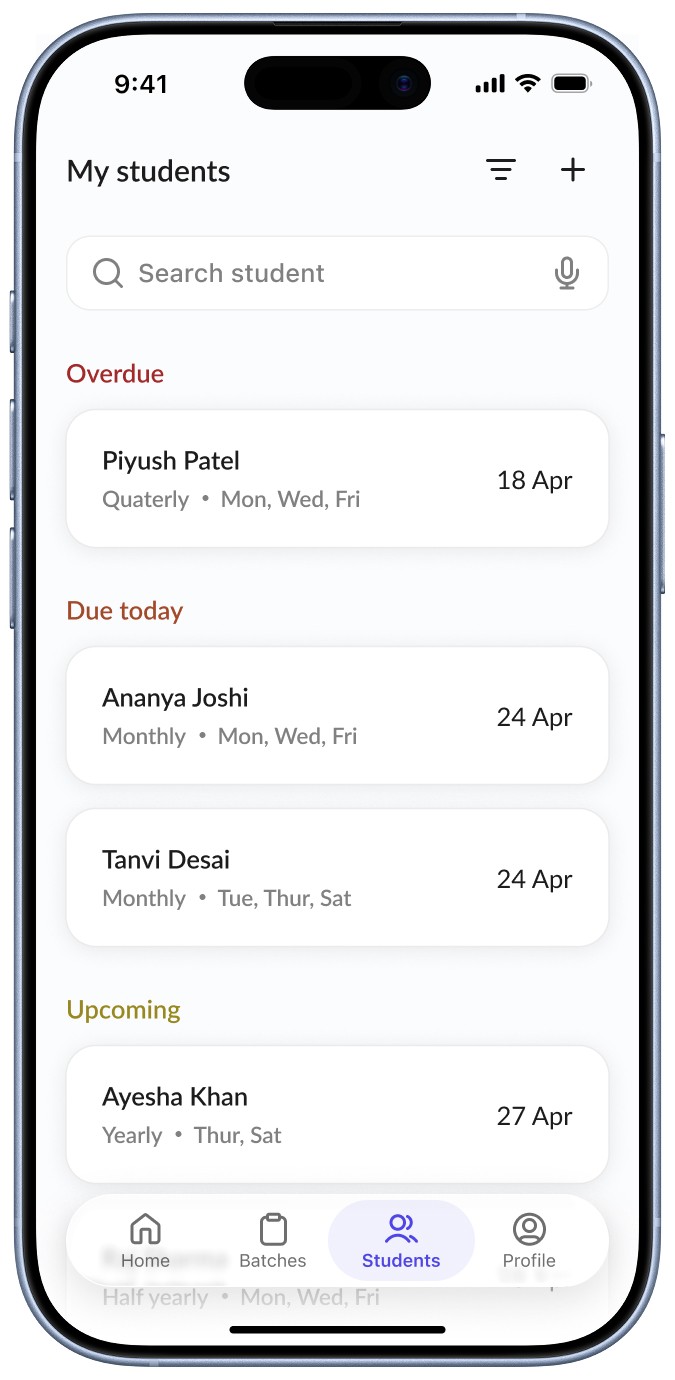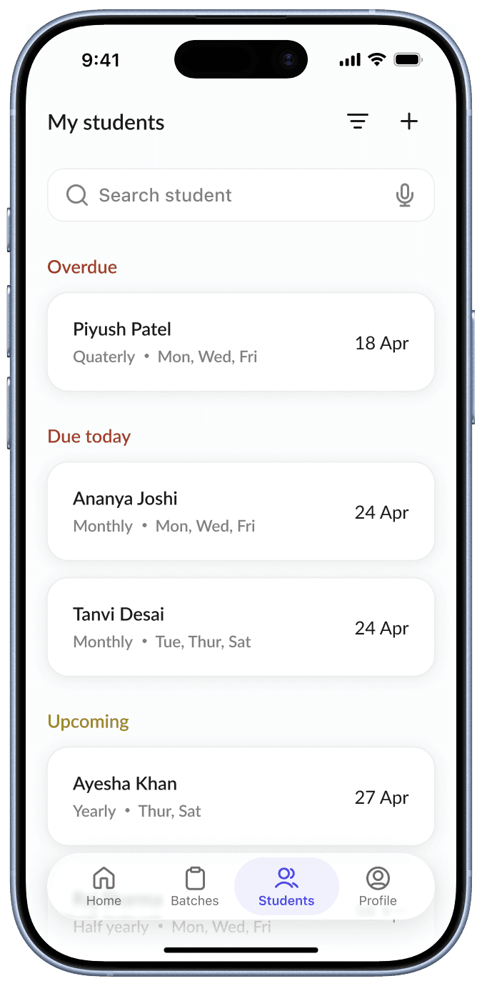Instead of treating fees as a separate system, this screen organizes information around students and their payment status, reflecting how teachers naturally think, in terms of which student has paid, who is due today, and who is overdue, rather than navigating a separate “fees” section.