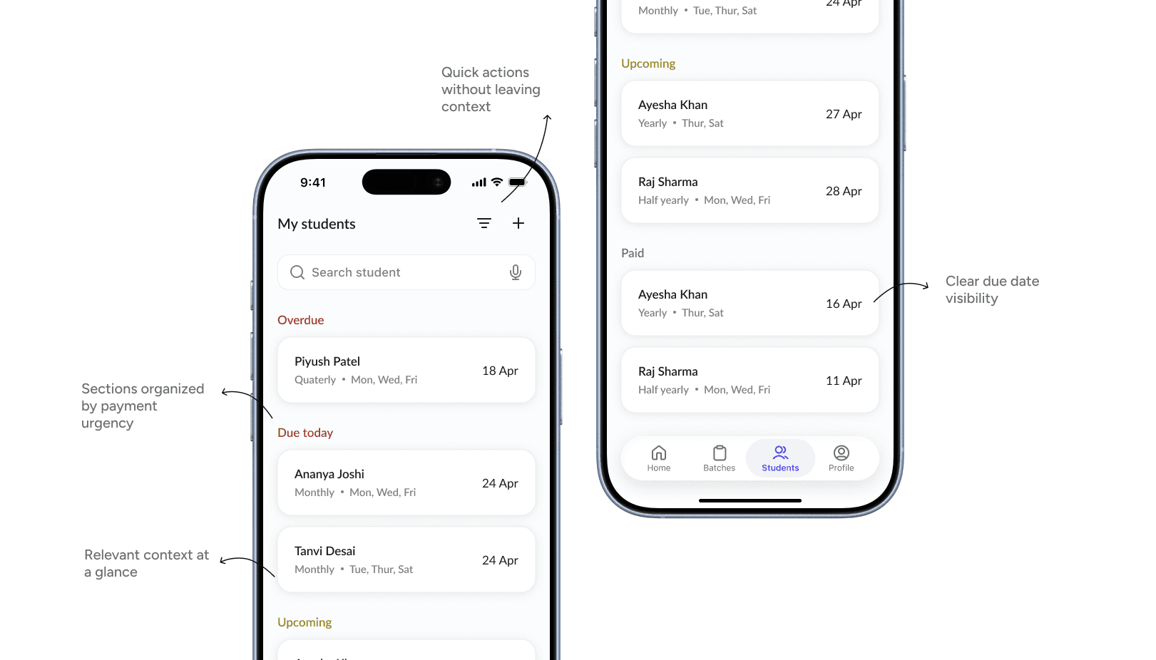 This led to restructuring the experience by integrating fees directly into the student list and grouping students into states like Overdue, Due today, Upcoming, and Paid. As a result, users can quickly scan who needs attention, without mentally mapping between sections, making actions faster and more intuitive.