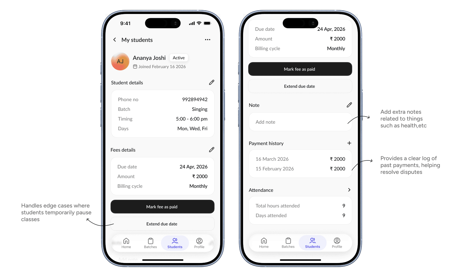 Instead of navigating across different sections, teachers can quickly understand a student’s status and take immediate action. Key actions like “Mark fee as paid” and “Extend due date” are placed prominently to support common workflows, including edge cases where students may pause classes temporarily, such as during exams