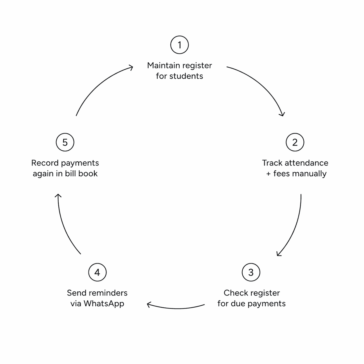 Solo educators often manage 20–60 students across multiple batches using registers, bill books, and WhatsApp. As student count grows, this fragmented system becomes difficult to manage, leading to missed reminders and delayed payments.