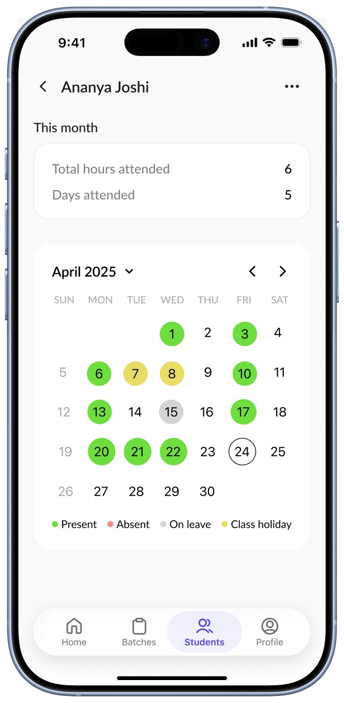 The student detail screen brings together all relevant information, including personal details, batch schedule, fees, and attendance, into a single view.