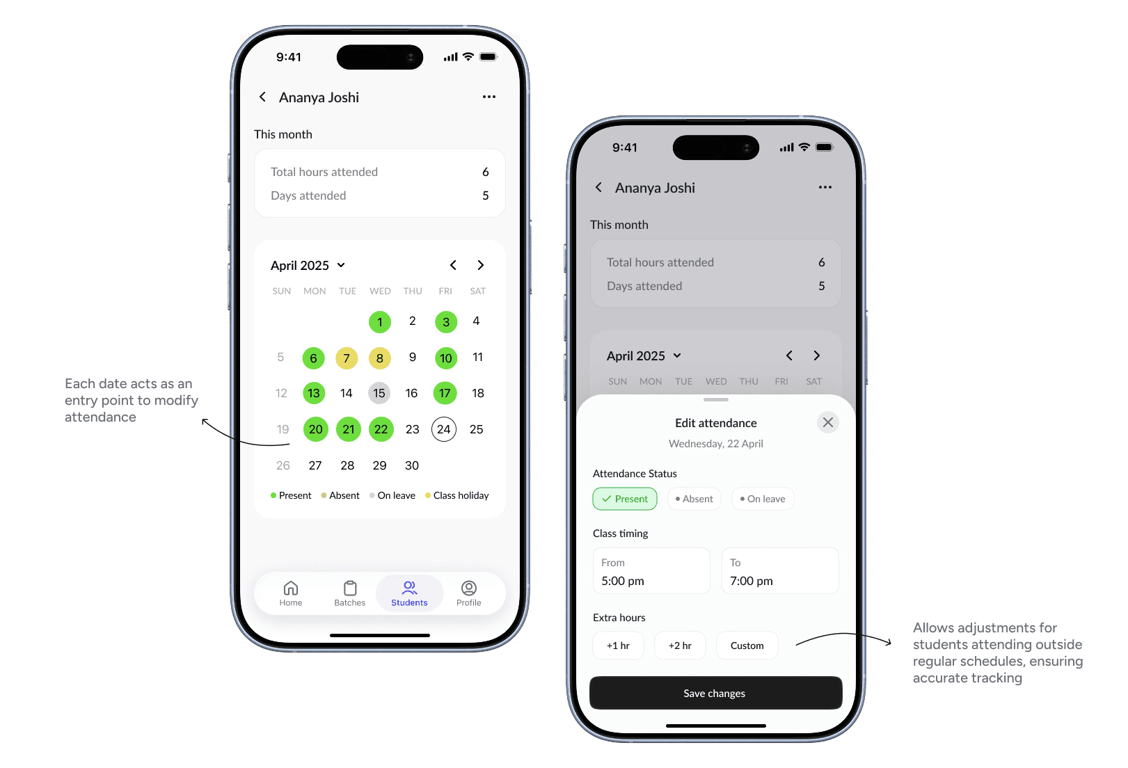 While most attendance follows a fixed batch schedule, real-world scenarios often vary. Students may attend extra sessions, come at different times, or require adjustments on specific days.