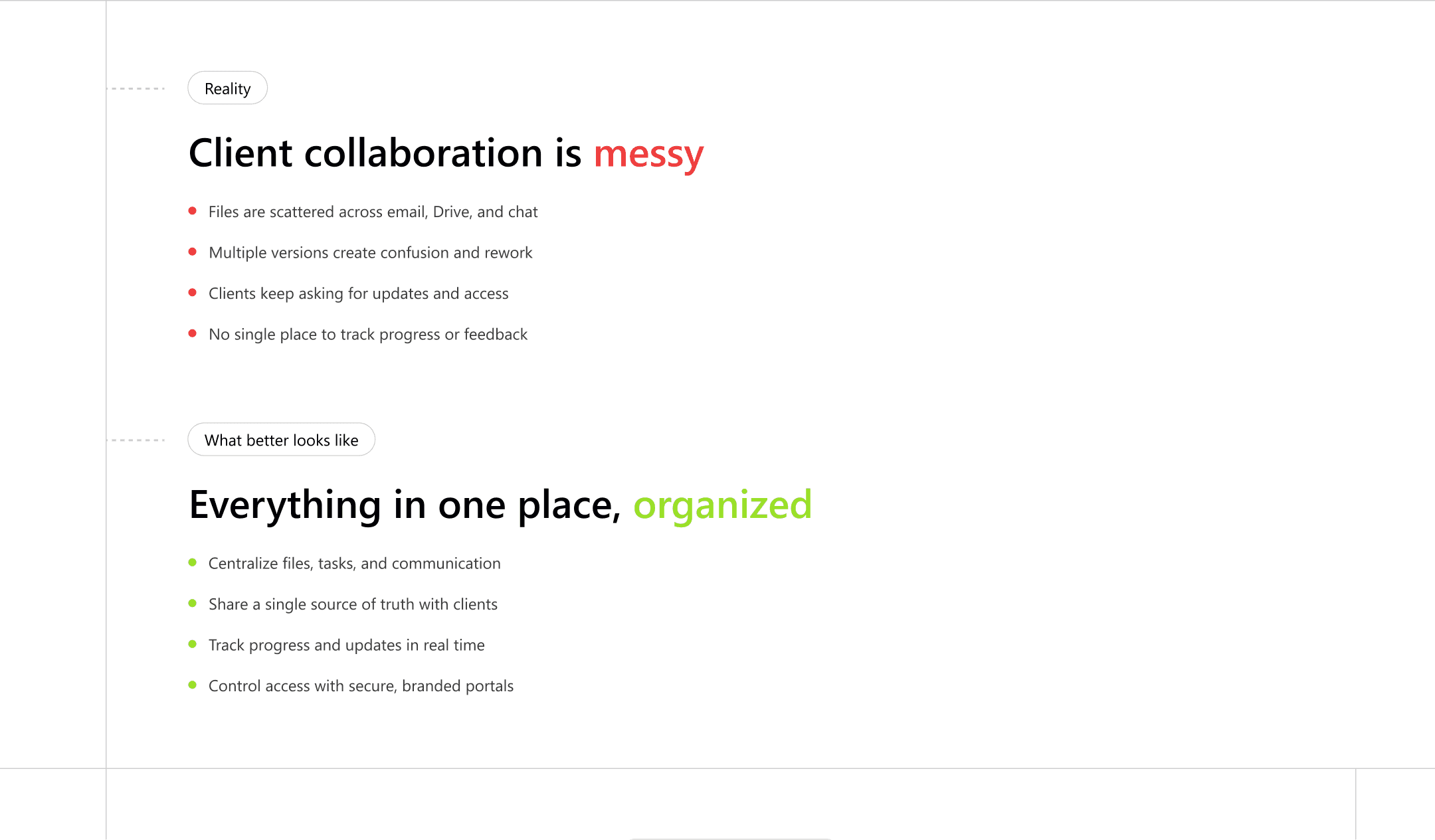 Instead of jumping straight into features, I introduced a problem-first section highlighting the chaos of client collaboration.